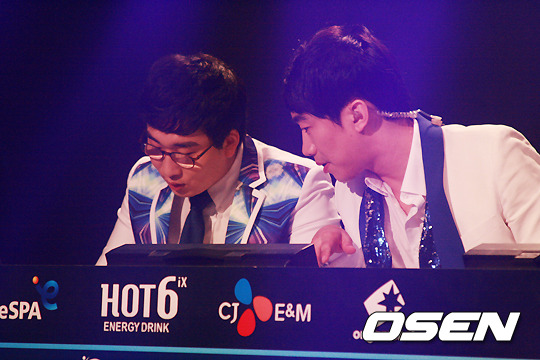 패하는 쪽이 탈락하는 제닉스 블라스트와 제닉스 스톰의 경기는 팀 킬이라 '롤챔스' 팬들의 관심을 더 모았다. 강민 해설위원과 성승헌 캐스터가 '롤챔스' 경기 화면에 집중하고 있다.