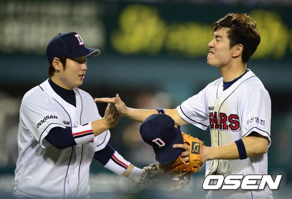 17일 오후 서울 잠실야구장에서 열린 '2013 한국야쿠르트 세븐 프로야구' 두산 베어스와 NC 다이노스의 경기, 6회초 수비를 마치고 두산 이원석과 김재호가 하이파이브를 하고 있다. 김재호는 무사에서 NC 김태군의 땅볼 타구를 몸날려 잡아내 아웃시키며 호수비를 펼쳤다.