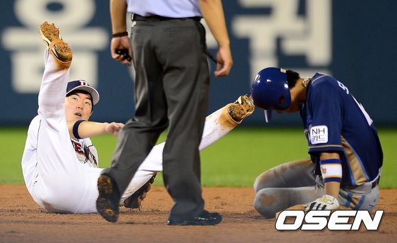 17일 오후 서울 잠실야구장에서 열린 '2013 한국야쿠르트 세븐 프로야구' 두산 베어스와 NC 다이노스의 경기, 7회초 2사 1루 NC 최재원 타석에 1루주자 모창민이 두산 김재호의 태그에 앞서 2루 도루에 성공하고 있다.