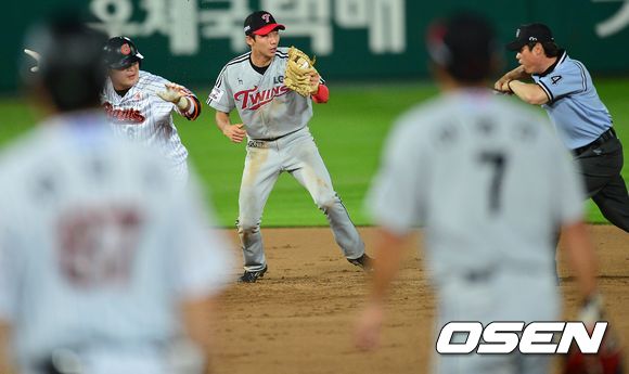 17일 오후 부산 사직구장에서 '2013 한국야쿠르트 세븐 프로야구' 롯데 자이언츠와 LG 트윈스의 경기가 열렸다. 7회말 롯데 공격 2사 주자없는 상황 8번타자 문규현이 좌익수 방면 안타를 날린 뒤 2루까지 내달리다 LG 2루수 김용의의 태그에 걸려 아웃되고 있다. 아웃을 선언하는 우효동 2루심.