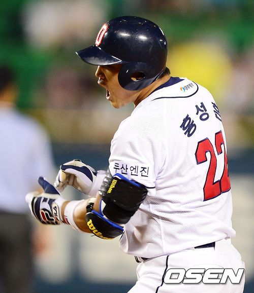 17일 오후 서울 잠실야구장에서 열린 '2013 한국야쿠르트 세븐 프로야구' 두산 베어스와 NC 다이노스의 경기, 8회말 2사 2루에서 두산 홍성흔이 1타점 적시타를 날리고 기뻐하고 있다.