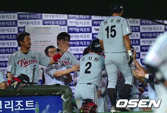 17일 오후 부산 사직구장에서 '2013 한국야쿠르트 세븐 프로야구' 롯데 자이언츠와 LG 트윈스의 경기가 열렸다. 8회초 LG 공격 1사 1, 2루 상황 7번타자 오지환이 중월 스리런포를 날리고 더그아웃 동료들과 인사를 나누고 있다.