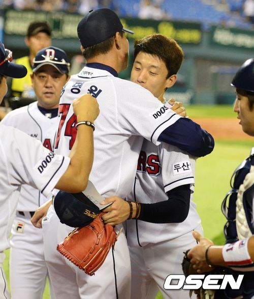 경기후 두산 오현택이 정명원 코치와 포옹을 하고 있다. /jpnews@osen.co.kr