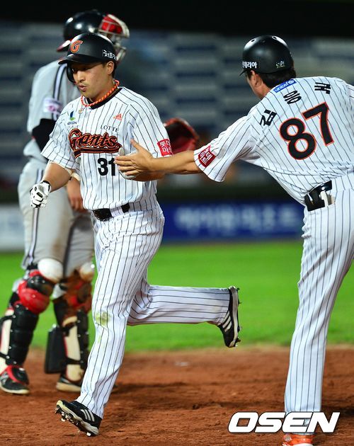 17일 오후 부산 사직구장에서 '2013 한국야쿠르트 세븐 프로야구' 롯데 자이언츠와 LG 트윈스의 경기가 열렸다. 9회말 롯데 공격 선두타자로 나선 3번 손아섭이 중월 솔로포를 날리고 홈베이스를 밟은 뒤 김응국 코치와 인사를 나누고 있다.