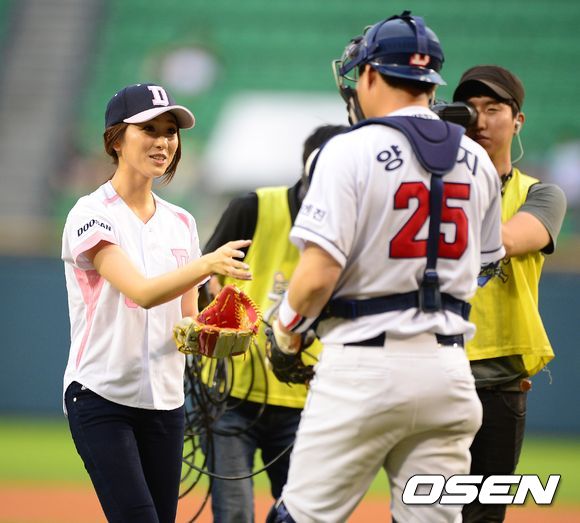 경기에 앞서 XTM 조유영 아나운서가 시구를 마치고 두산 양의지와 인사를 나누고 있다. /jpnews@osen.co.kr