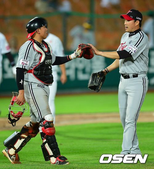 9회말 2사 1, 3루 상황 황재균을 중견수 플라이로 이끌며 경기를 마무리지은 LG 투수 봉중근이 포수 윤요섭과 인사를 나누고 있다. /dreamer@osen.co.kr