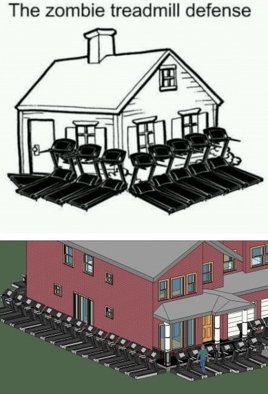 이 사진에는 집 주변을 런닝머신으로 빙 둘러 설치해 놓은 것이 인상적이다. 이는 무조건 앞으로만 가는 직진본능을 지닌 좀비의 특징을 간파한 것에 착안한 발상이다.