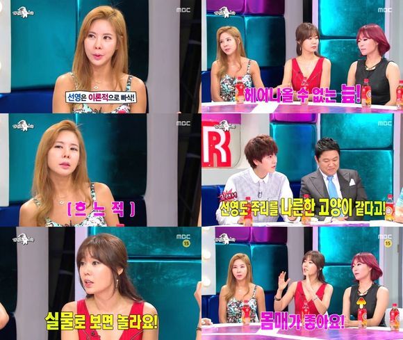 이에 안선영 역시 정주리를 나른한 고양이라고 표현하며 "워낙 정주리가 TV에서 임팩트가 강하기 때문에 기대치가 바닥이다. 그래서 실물을 보면 다들 놀라고 몸매가 정말 좋다. 연하남을 사로잡으려면 얼굴보단 몸매가 더 좋아야 한다"고 칭찬했다.