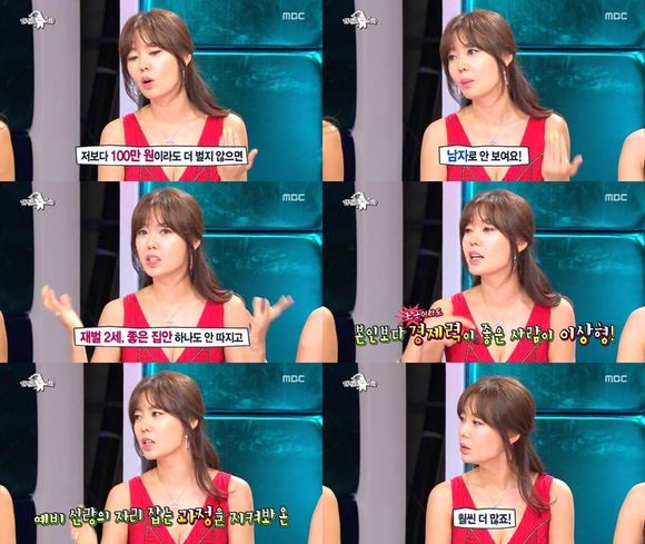 그는 이날 "원래 나는 연하를 좋아하지 않았다. 나는 속물이라 나보다 100만 원이라도 더 벌지 않으면 남자로 안 보인다. 재벌 2세, 좋은 집안 하나도 따지지 않고 나보다 경제력이 좋은 사람이 이상형이다. 그런데 또래에 나만큼 버는 사람이 없다"고 말했다.
