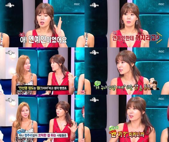 이에 MC들이 "도대체 그 모임이 어떤 모임이길래"라고 묻자 "연예인이었다. 아이돌이었다"고 고백했다. 이에 MC 규현이 1988년생 아이돌 이름들을 대며 물었고 안선영이 "아니다'라고 고개를 젓자 "그럼 1987년~1989년생이냐"고 재차 물었고 안선영은 규현의 집요함에 혀를 내둘렀다.
