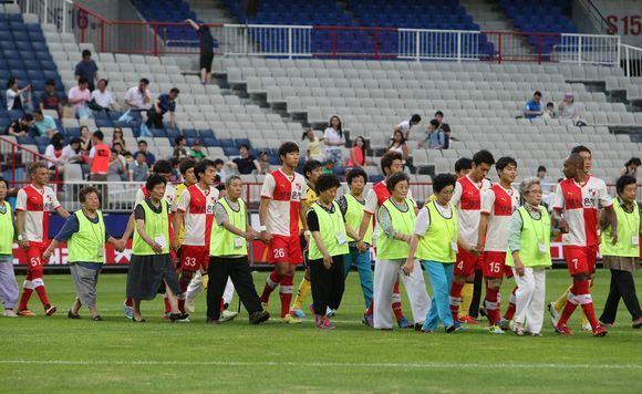 지난 화요일 프로축구경기가 펼쳐진 부산 아시아드 주 경기장에 이색적인 풍경이 연출됐다. 지난 16일 펼쳐진 부산과 전남의 K리그 클래식 경기에 100여명의 노인들이 경기장에 초청됐다. 노인들을 초청했다면 으레 선수단에게 간단히 격려를 하고 시축을 하는 모습이 상상된다. 하지만 부산 홈경기에서는 달랐다. 단순한 격려가 아닌 선수와 초청된 노인분들이 서로 손을 잡고 경기장으로 동반 입장을 한 것이다.