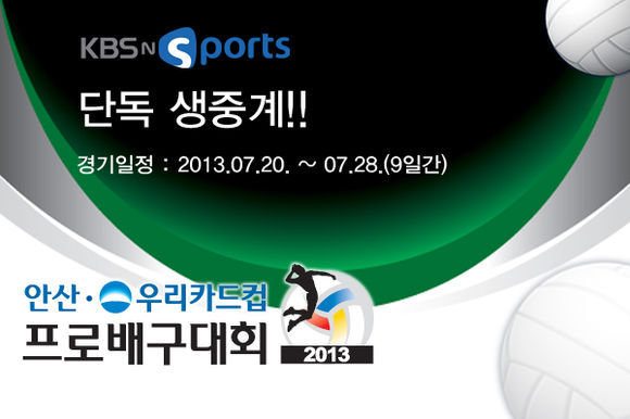 KBS N Sports는 오는 20일부터 28일까지 9일간 안산시 상록수 체육관에서 열리는 2013 안산∙우리카드컵 프로배구대회 전 경기를 중계한다고 밝혔다.