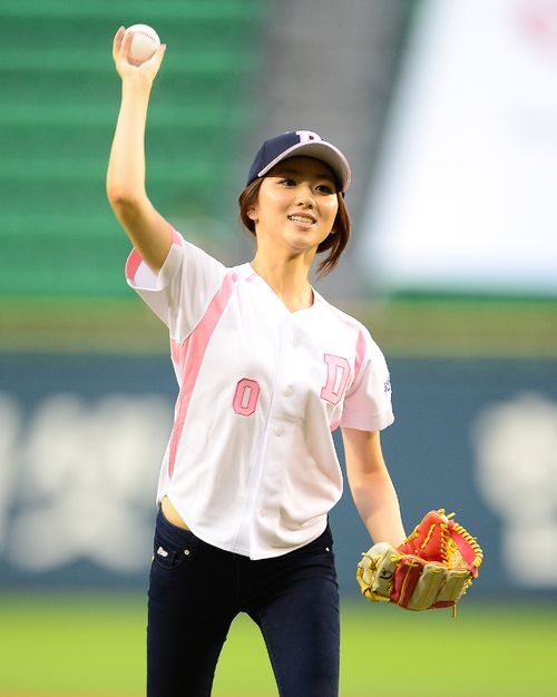 17일 오후 서울 잠실야구장에서 열린 '2013 한국야쿠르트 세븐 프로야구' 두산 베어스와 NC 다이노스의 경기, 경기에 앞서 XTM 조유영 아나운서가 멋진 자세로시구를 했다.