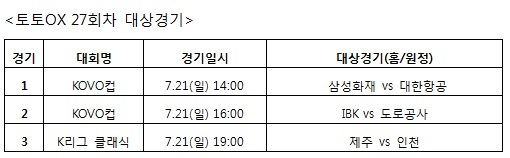 [스포츠토토] 국민체육진흥공단(www.kspo.or.kr)이 발행하는 체육진흥투표권 수탁사업자인 스포츠토토(www.sportstoto.co.kr)가 KOVO컵 삼성화재-대한항공(1경기), IBK-도로공사(2경기), K클래식 제주-인천(3경기) 전 등 3경기를 대상으로 '토토OX' 27회차를 발매한다고 밝혔다.