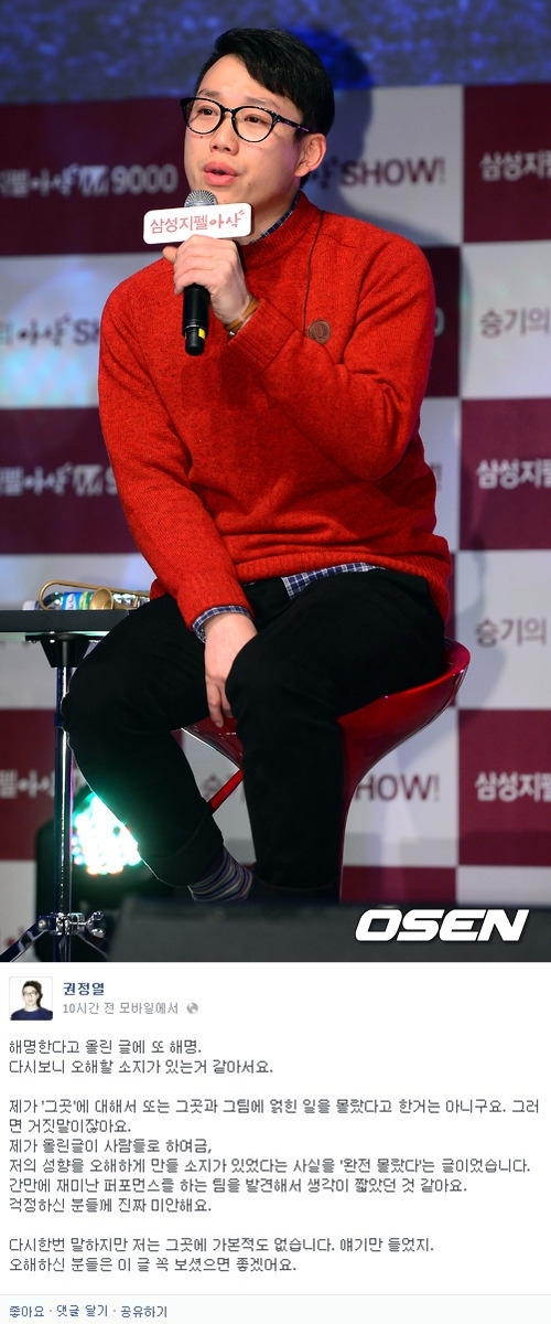 권정열은 지난 18일 자신의 페이스북에 "해명한다고 올린 글에 또 해명. 다시 보니 오해할 소지가 있는 것 같다"며 최근 불거진 '일베' 논란에 대해 해명하는 글을 올렸다.