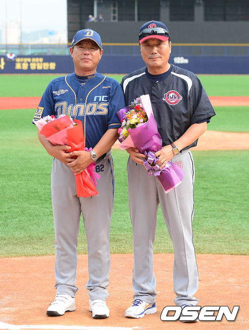 18일 오후 경북 포항시 포항야구장에서 열린 '2013 퓨처스리그 올스타전' 경기 시작 전 한문연 감독과 유승안 감독이 기념촬영을 하고 있다.