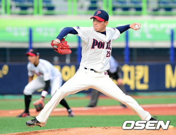 18일 오후 경북 포항시 포항야구장에서 열린 '2013 퓨처스리그 올스타전' 남부리그와 북부리그의 경기 1회초 북부리그 선발 윤지웅이 역투하고 있다.