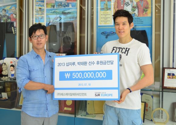 박태환은 18일 오전 서울 강남 모처에서 후원사로 나선 이러닝 전문업체 SJR 기획 우형철 대표와 만나 2년 동안 10억 원의 훈련지원금을 약속받았다.