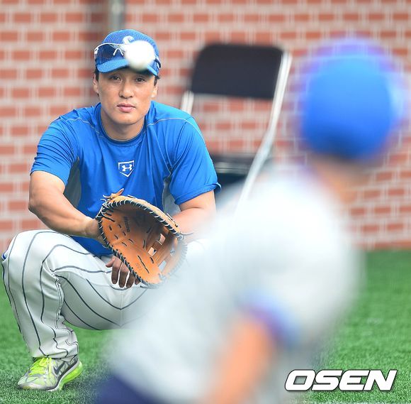 18일 오후 경북 포항시 포항야구장에서 '2013 퓨처스리그 올스타전'이 열렸다. 삼성 이승엽이 아들 은혁군과 함께 경기장을 찾아 캐치볼을 하고 있다.