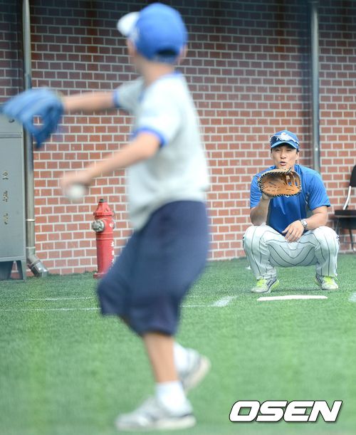 18일 오후 경북 포항시 포항야구장에서 '2013 퓨처스리그 올스타전'이 열렸다. 삼성 이승엽이 아들 은혁 군과 함께 경기장을 찾아 캐치볼을 하고 있다.