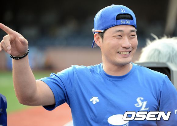 18일 오후 경북 포항시 포항야구장에서 '2013 퓨처스리그 올스타전'이 열렸다. 삼성 오승환이 지인과 인사를 나누며 환하게 미소짓고 있다.