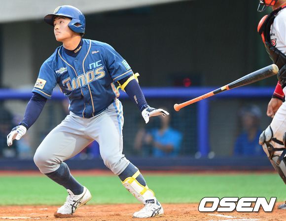 18일 오후 경북 포항시 포항야구장에서 '2013 퓨처스리그 올스타전'이 열렸다. 7회초 남부리그 공격 2사 1, 3루 상황 NC 강진성이 1타점 적시 좌전안타를 날리고 타구를 바라보고 있다.