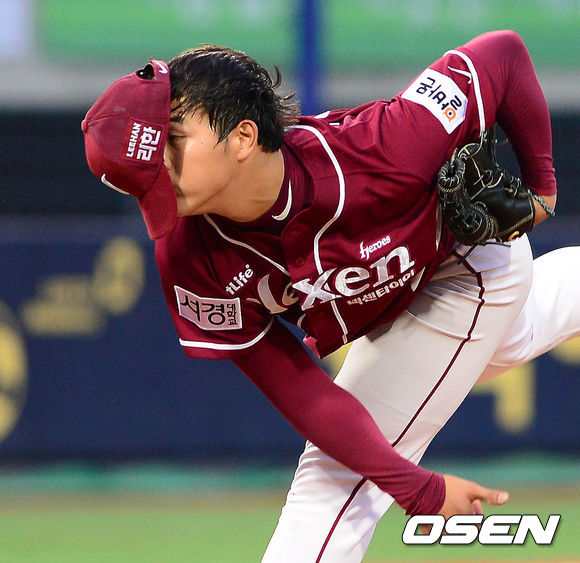 18일 오후 경북 포항시 포항야구장에서 열린 '2013 퓨처스리그 올스타전' 남부리그와 북부리그의 경기 8회말 조상우가 공을 던지면서 모자가 벗겨지고 있다.