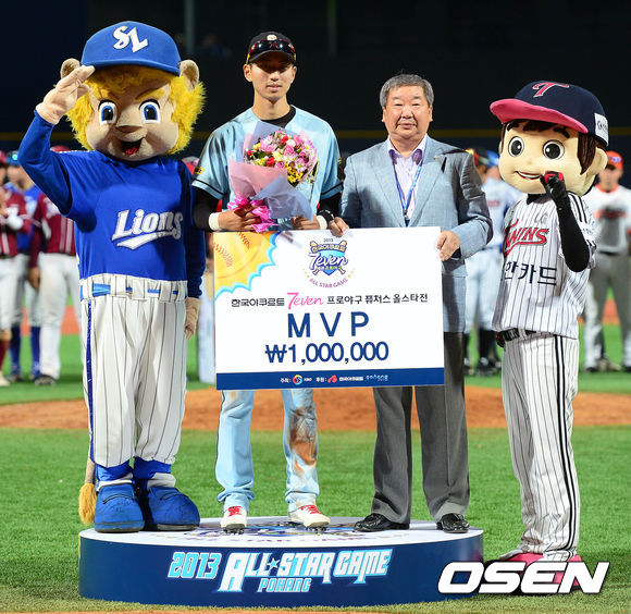 18일 오후 경북 포항시 포항야구장에서 열린 '2013 퓨처스리그 올스타전' 경기 종료 후 시상식에서 MVP를 수상한 정진호가 구본능 KBO 총재와 기념촬영을 하고 있다.