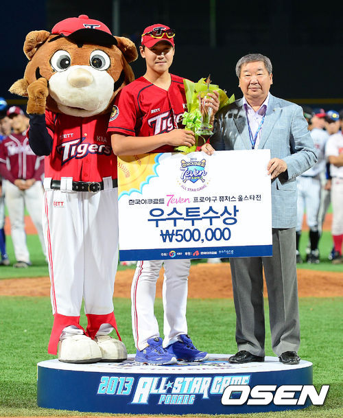 18일 오후 경북 포항시 포항야구장에서 열린 '2013 퓨처스리그 올스타전' 경기 종료 후 시상식에서 우수투수상을 수상한 김윤동이 구본능 KBO총재와 기념촬영을 하고 있다.
