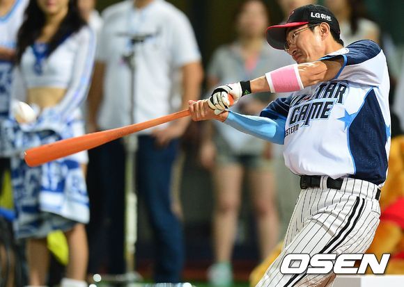 18일 오후 경북 포항시 포항야구장에서 '2013 퓨처스리그 올스타전'이 열렸다. 경기 종료 직후 진행된 1군 올스타들의 홈런레이스에서 LG 정성훈이 홈런포를 날리고 있다.
