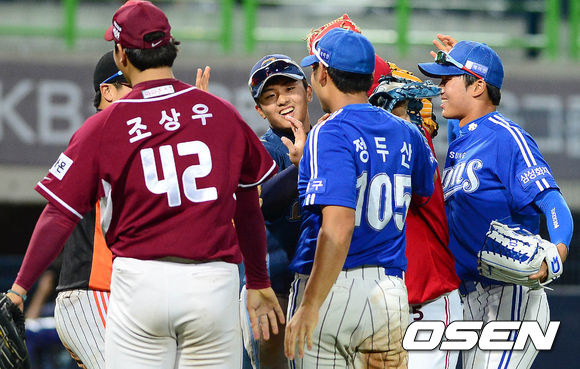 18일 오후 경북 포항시 포항야구장에서 열린 '2013 퓨처스리그 올스타전' 경기 종료 후 남부리그 선수들이 승리를 기뻐하고 있다.