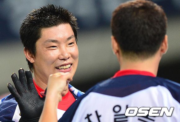 18일 오후 경북 포항시 포항야구장에서 열린 '2013 퓨처스리그 올스타전' 경기 종료 후, 1군 올스타들의 홈런레이스에서 나지완이 박병호와의 4강 서든데스에서 승리를 거둔 뒤 환하게 미소지으며 팀동료 차일목과 인사를 나누고 있다.