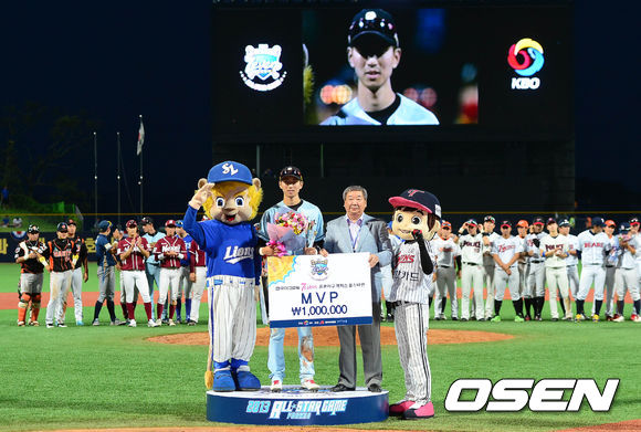 18일 오후 경북 포항시 포항야구장에서 열린 '2013 퓨처스리그 올스타전' 경기 종료 후 시상식에서 MVP를 수상한 정진호가 구본능 KBO 총재와 기념촬영을 하고 있다.