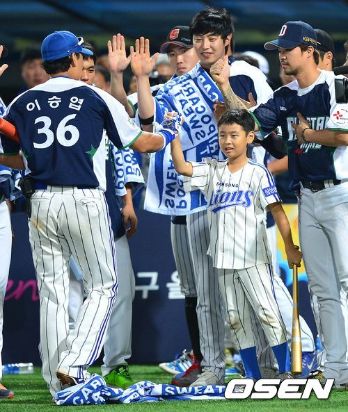 1군 올스타들의 홈런레이스에서 우승을 차지한 이승엽이 아들 은혁군과 하이파이브를 하며 기뻐하고 있다.