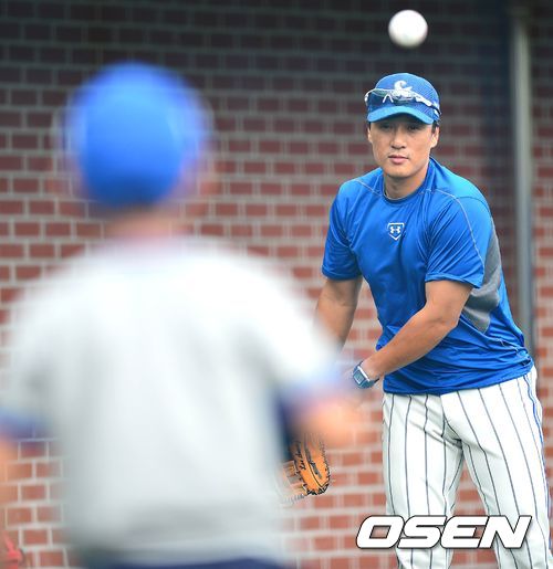 1군 올스타들의 홈런레이스에서 우승을 차지한 이승엽이 퓨처스 올스타전 중 경기장을 더그아웃에서 아들 은혁군과 함께 캐치볼을 하고 있다.
