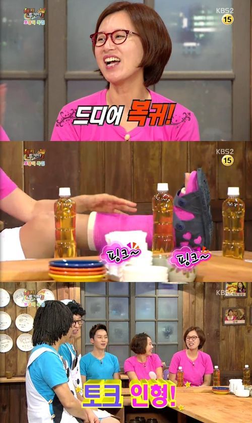 다리 부상을 당했던 방송인 박미선이 '해피투게더3'에 복귀했다.
