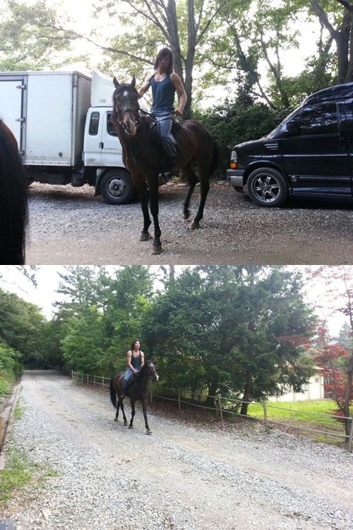 19일 공개된 사진 속 엄태웅은 촬영이 끝난 후에도 촬영장에 남아 승마연습을 하는 모습. 민소매 의상을 입고 말 위에 앉아 구슬땀을 흘리고 있다.