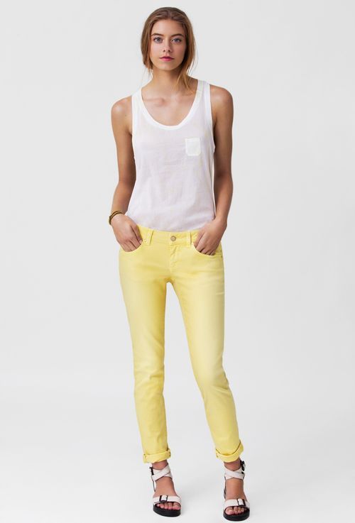 컬러 데님은 상의를 어떻게 매치하는냐에 따라 센스 있는 캐주얼룩에서 여성스러운 로맨틱 룩까지 다양한 룩을 넘나들 수 있다. 평상시 캐주얼한 스타일을 즐겨 입는 사람이라면, 심플한 티셔츠나 셔츠 스타일의 상의에 캘빈클라인 진 컬러 데님 팬츠의 밑단을 접어 올려 발목 길이의 하이탑 스니커즈, 앵클 스트랩 플랫슈즈 등을 매치하면 센스 있는 캐주얼 스타일을 연출할 수 있다.