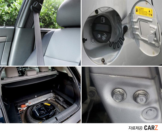 그리고 차량 내 전기장치인 시거잭도 침수가 되면 쉽게 녹이 생기므로 확인하고, 연료 주입구처럼 캡으로 숨겨져 있어 청소가 소홀하기 쉬운 부분도 녹의 흔적이나 이물질이 있는지 확인한다. 스페어타이어를 보관하는 공간도 홈이 많이 파여 침수 시 부식이 잘 될 수 있는 부분이니 장마철 이후 중고차를 구입한다면 꼭 체크하도록 한다.