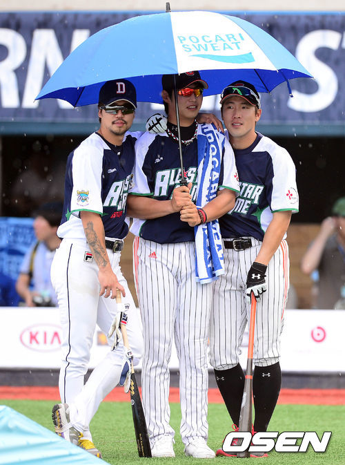 번트왕 이벤트중 비가 내리자 오재원, 김대우, 전준우가 우산을 쓰고 그라운드에 서 있다.