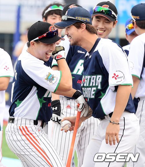 19일 오후 경북 포항시 포항야구장에서 열린 '2013 한국야쿠르트 세븐 프로야구 올스타전' 경기, 경기에 앞서 '얼려먹는 세븐 번트왕' 이벤트에서 두산 오재원이 준우승을 차지하고 롯데 손아섭에 뽀뽀를 하며 기뻐하고 있다.