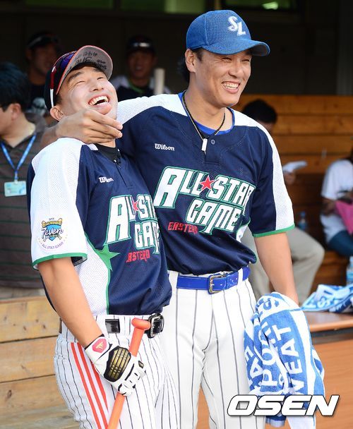 19일 오후 경북 포항시 포항야구장에서 열린 '2013 한국야쿠르트 세븐 프로야구 올스타전' 경기, 경기에 앞서 롯데 손아섭과 삼성 이승엽이 더그아웃에서 장난을 치고 있다.