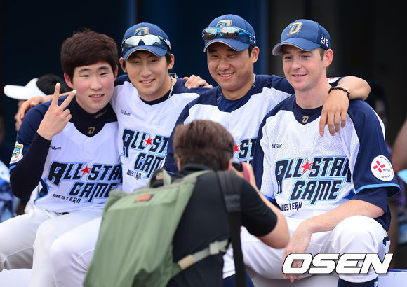 덕아웃에서 NC 이재학, 나성범, 김태군, 찰리가 기념촬영을 하고 있다.