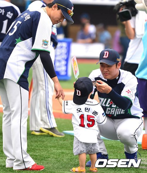 두산 홍상삼이 팀동료 오현택의 아들 민준군에게 선글라스를 씌워주고 있다.