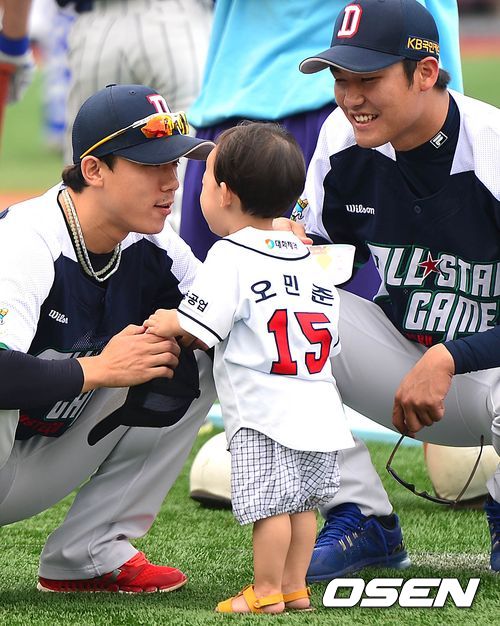 두산 홍상삼이 팀동료 오현택의 아들 민준군과 대화를 나누고 있다.