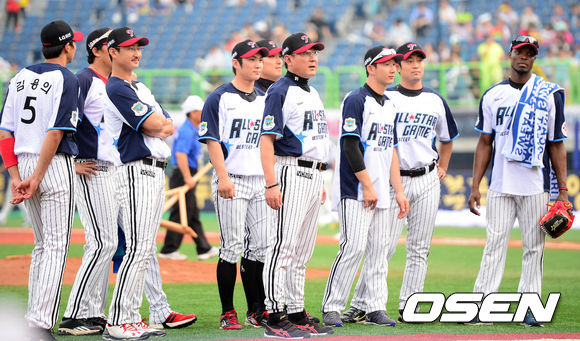 19일 오후 경북 포항시 포항야구장에서 열리는 '2013 한국야쿠르트 세븐 프로야구 올스타전' 경기 시작전 LG 김기태 감독을 비롯한 선수들이 그라운드에 서 있다.