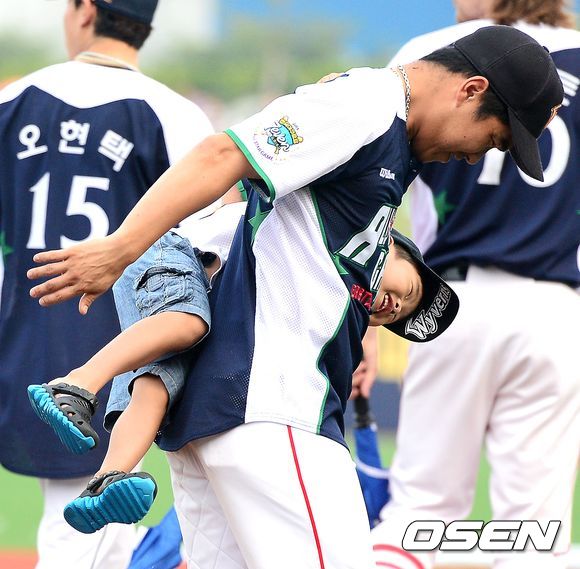 19일 오후 경북 포항시 포항야구장에서 열린 '2013 한국야쿠르트 세븐 프로야구 올스타전' 경기, 경기에 앞서 SK 정근우가 아들과 함께 그라운드에서 즐거운 시간을 보내고 있다.