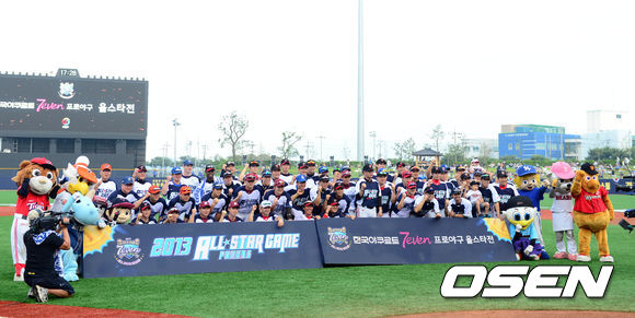 19일 오후 경북 포항시 포항야구장에서 열리는 '2013 한국야쿠르트 세븐 프로야구 올스타전' 경기 시작전 선수들이 기념촬영을 하고 있다.