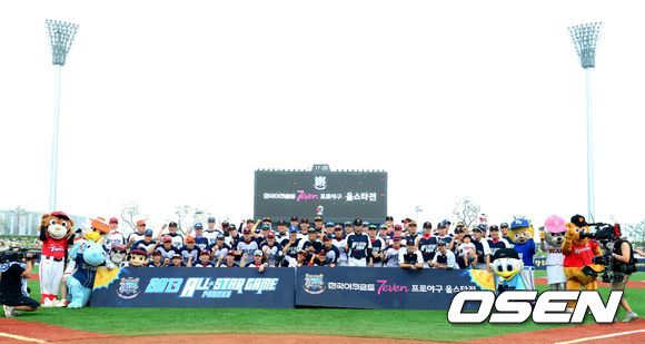 19일 오후 경북 포항시 포항야구장에서 열린 '2013 한국야쿠르트 세븐 프로야구 올스타전' 경기, 경기에 앞서 올스타에 선정된 선수들이 포토타임을 하고 있다.