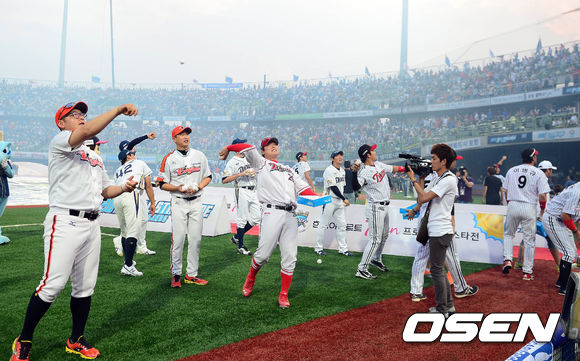 19일 오후 경북 포항시 포항야구장에서 열린 '2013 한국야쿠르트 세븐 프로야구 올스타전' 경기 시작 전 선수들이 기념공을 팬들에게 던져주고 있다.
